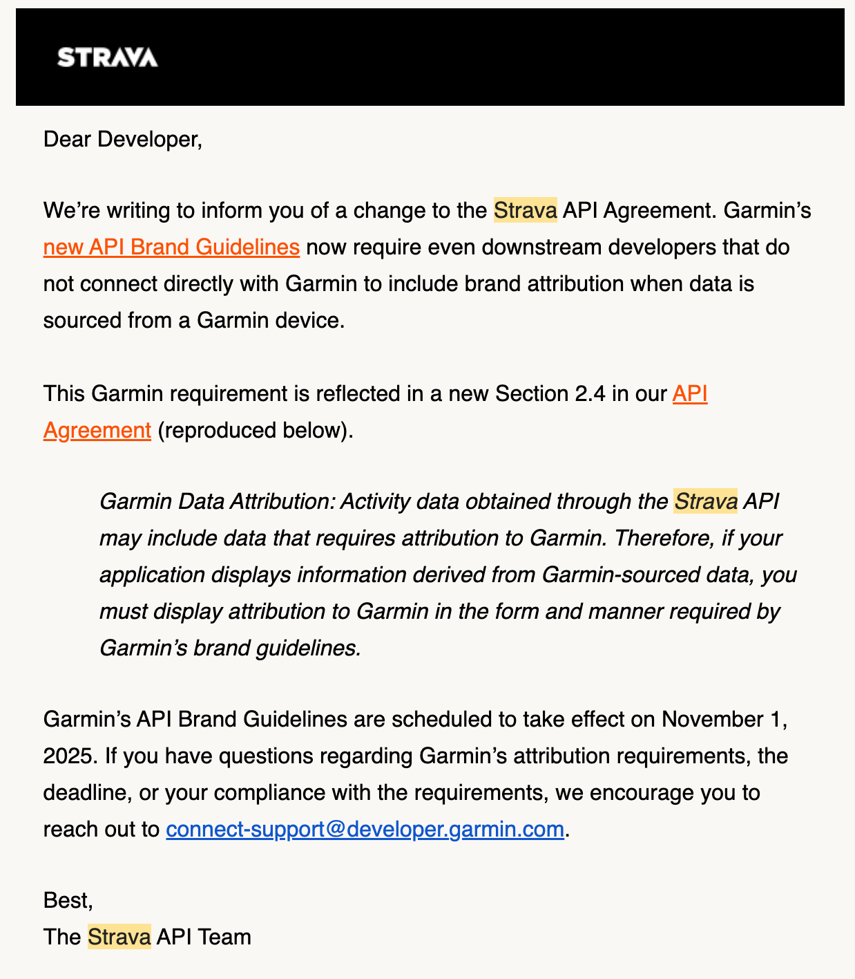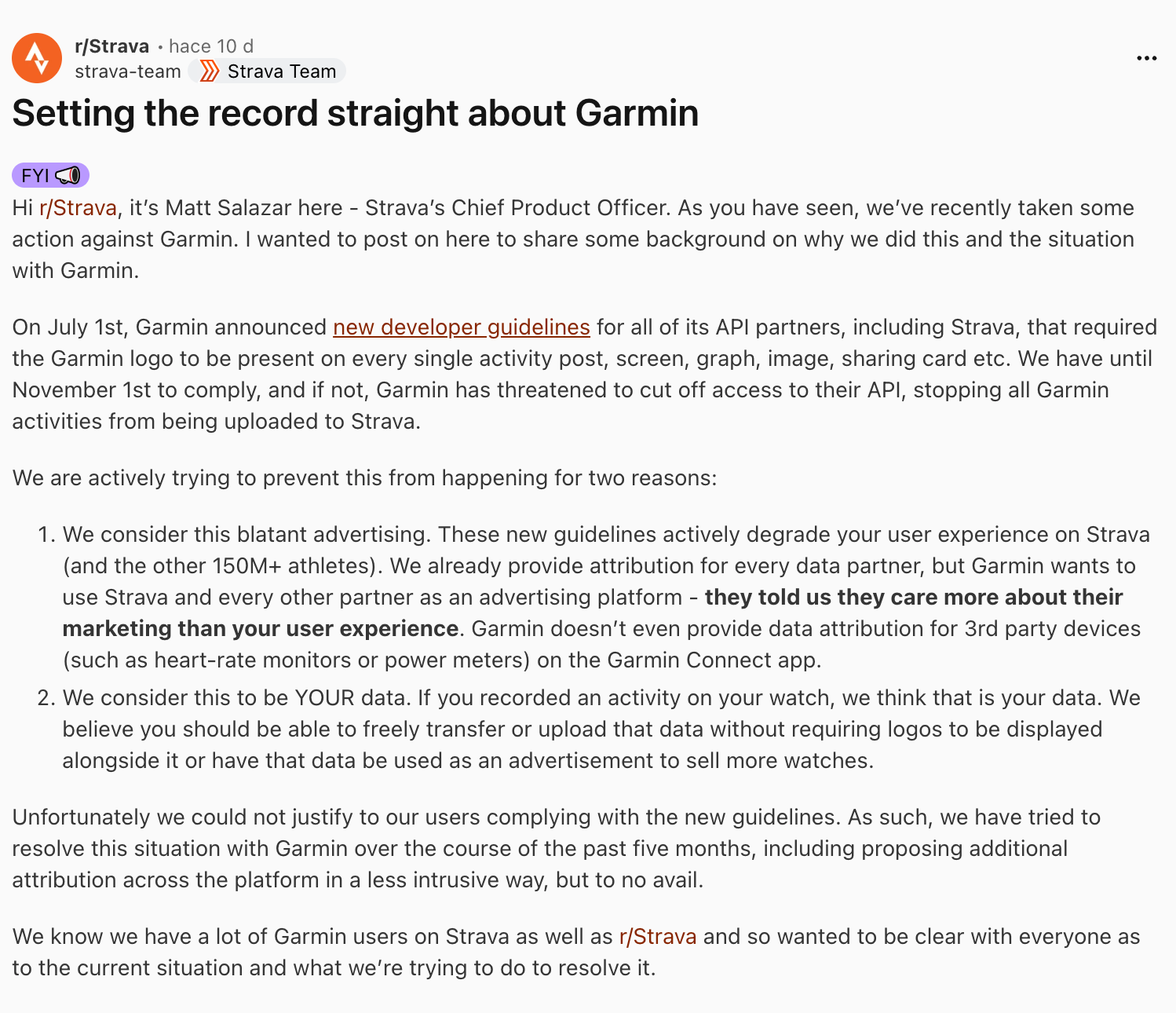 El CPO de Strava ha salido a aclarar el por qué directamente en Reddit, y, ¡sorpresa! no tiene mucho que ver con las causas de la demanda: afirma que en abril entraron unos nuevos guidelines de Garmin en los que piden que todos los datos provenientes de sus dispositivos tengan un distintivo que afirme que son de Garmin. Choca mucho que estén presentando una queja de forma tan intensa visto cómo la propia Strava viene tratando a sus usuarios de API los últimos meses, como ya comentamos en la parte 2. Además, no es estrictamente cierto, pues aunque desde Strava afirman que todo debe tener un "logo" de Garmin, la realidad es que Garmin requiere una atribución que puede ser tan frugal como un pequeño fragmento de texto.
